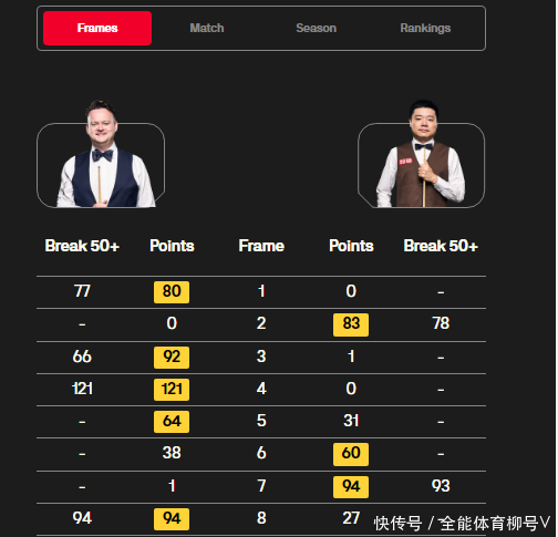 他在前两局打出单杆52分、100分,很快取得2-0领先优势。第四局结束后,丁俊晖的领先优势变成3-1,领先路易-希斯科特两局结束上半场。